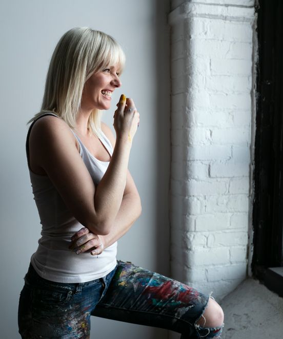 « Je m'inspire de l'enveloppe corporelle fragmentée que je marque par une gestuelle spontanée de couleurs vibrantes. L'expérience de la peinture m'amène à regarder différemment, à la découverte de soi, jusqu'à l'étonnement.